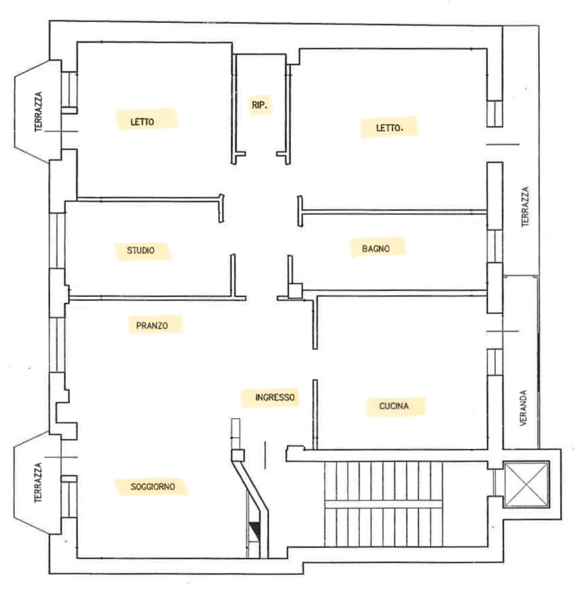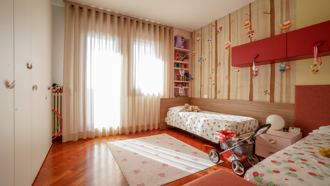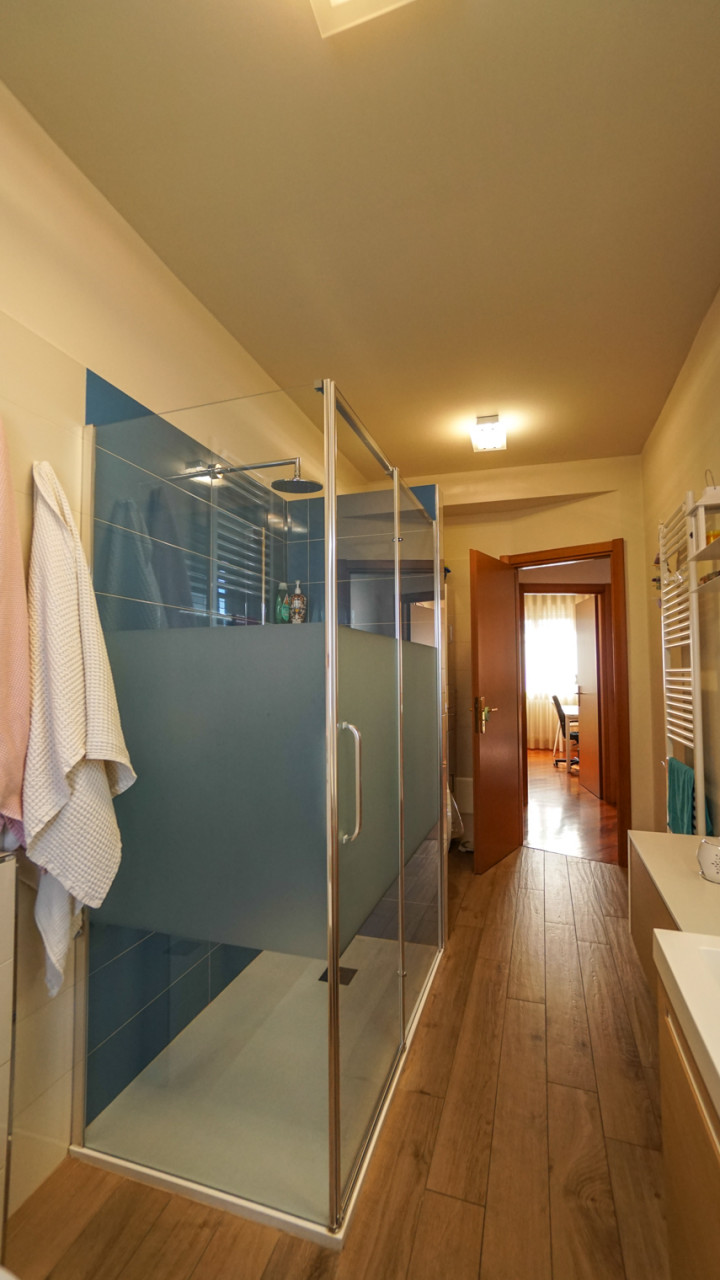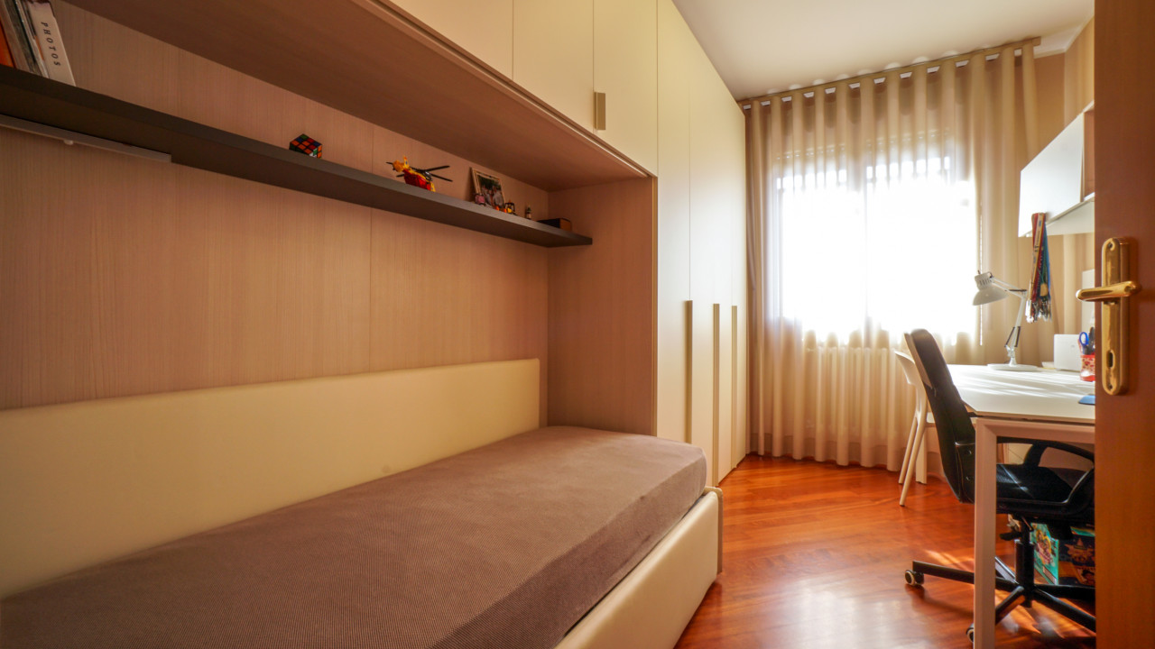 Gli ampi spazi interni sono progettati per garantire comfort e funzionalità e sono stati ottimizzati per sfruttare la luce naturale durante tutto il giorno, creando così un'atmosfera accogliente. L'appartamento si apre con un ingresso che conduce ad un soggiorno spazioso composto da salotto e tavolo da pranzo, separato dalla cucina. Nel reparto notte sono presenti due spaziose camere da letto, un bagno completo finestrato, una stanza ad uso studio/camera e un ripostigio.